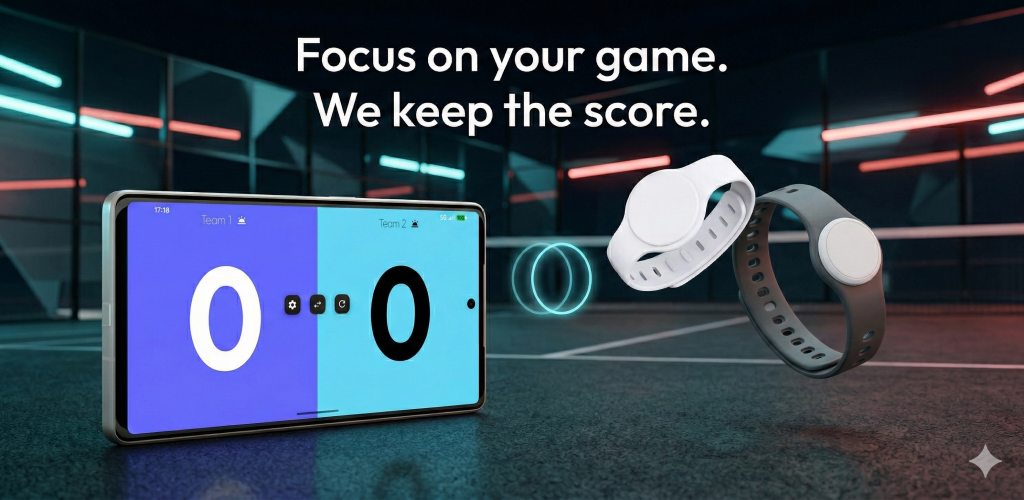 Der ultimative tragbare Bluetooth Score-Tracker für Padel, Tennis und Squash. Behalte den Ball im Auge, tracke Punkte mit einem Klick und lass die App den Rest erledigen.